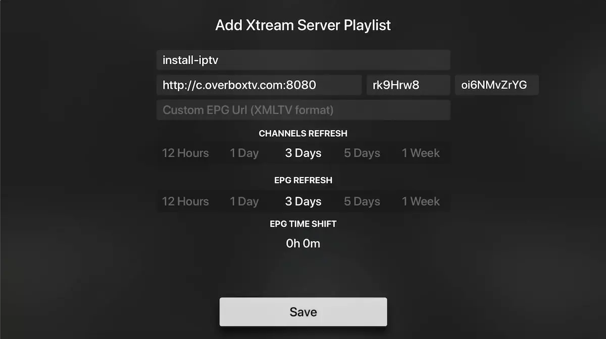 To connect using the Xtream Server login, enter the following details provided by your IPTV provider: