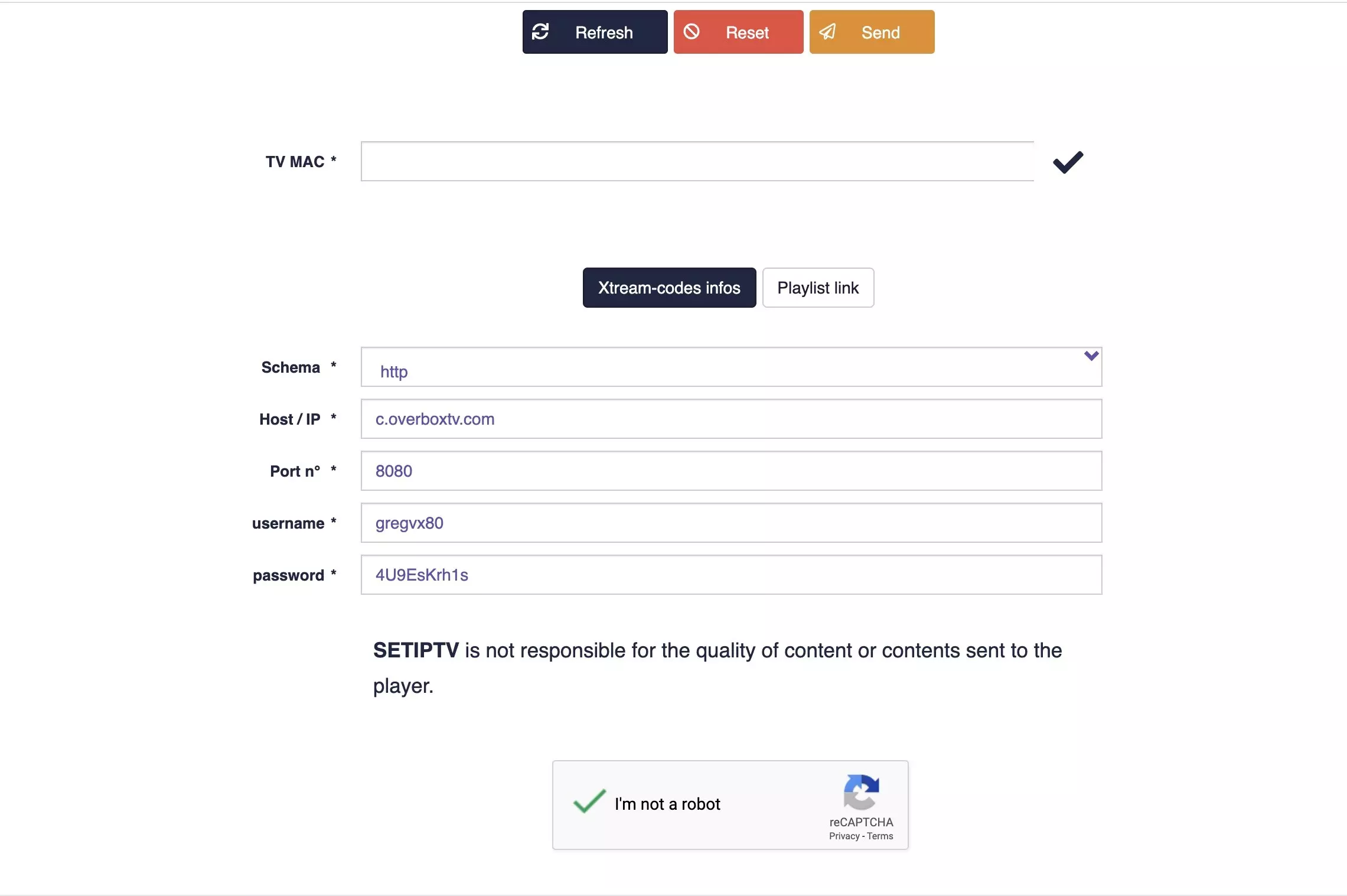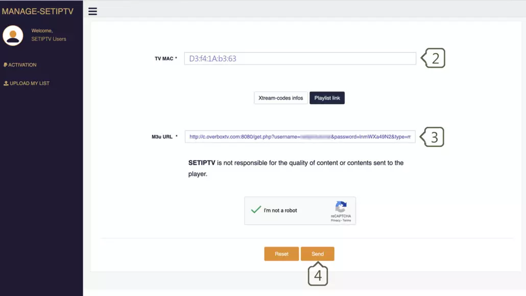 You must active captcha (I’m not robot) and click send. Restart your TV and open SET IPTV again , Enjoy thousands TV channels, movies and series .