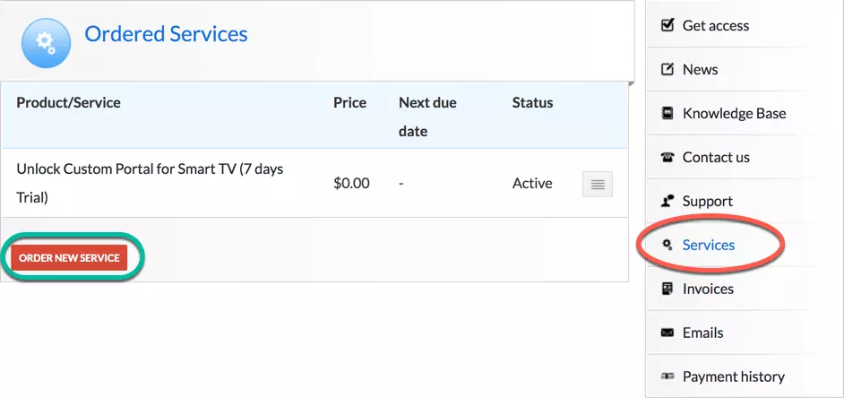 From the left menu, click on “Services“. The free 7 days trial we activated earlier is listed. Now let`s add a paid license starting by clicking on “Order New Service“.
